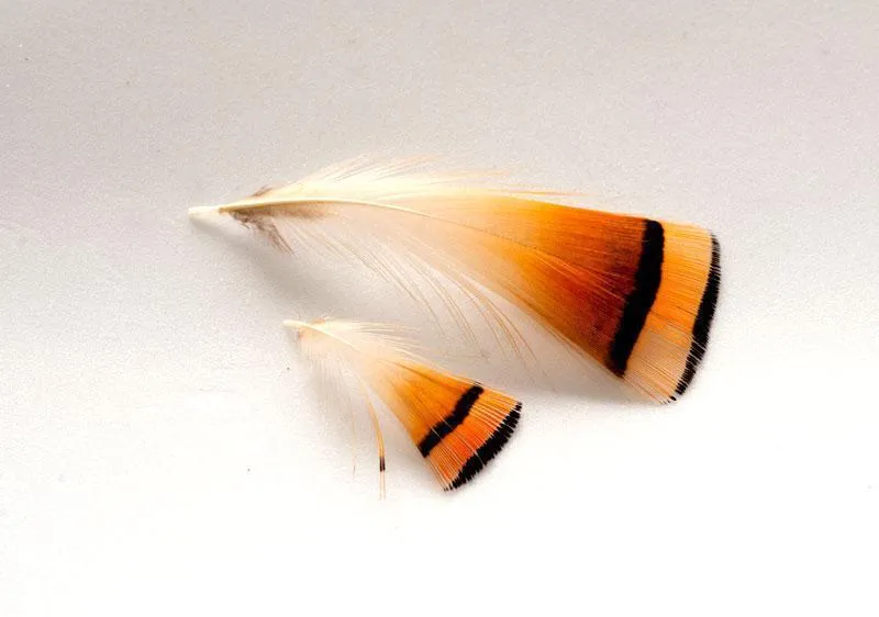 The golden pheasant tippet is a true character feather from the bird, unique in shape and color and very colorful